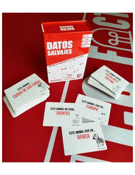 ¡espinoso!? En Datos Salvajes las pistas se acumulan y la tensión crece. Deberás pensar rápido, improvisar y, cuando sea necesario, farolear como un maestro. Cada turno añade un nuevo rasgo, y tendrás que acertar o arriesgarte a que te desenmascaren. Un party game salvaje, lleno de risas e ingenio, donde ganar depende tanto de tus conocimientos como de tu habilidad para convencer. Fácil de aprender, imposible jugar solo una vez.