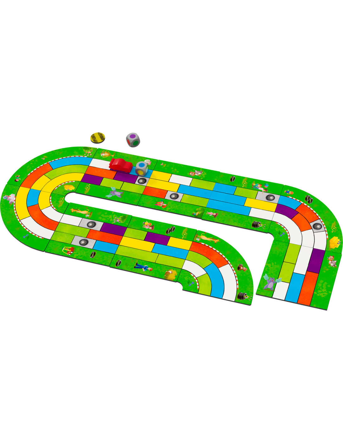 En Monza, además de un veloz coche de carreras, se necesitan tácticas astutas y un poco de suerte. Los dados de colores indican las casillas de la pista de carreras que se pueden avanzar. ¿Qué carril se tomará y cuándo comenzará una maniobra de adelantamiento? Ganará quien cruce primero la línea de meta. Los dados de colores indican las casillas de la pista de carreras que se pueden avanzar. Ganará quien cruce primero la línea de meta.