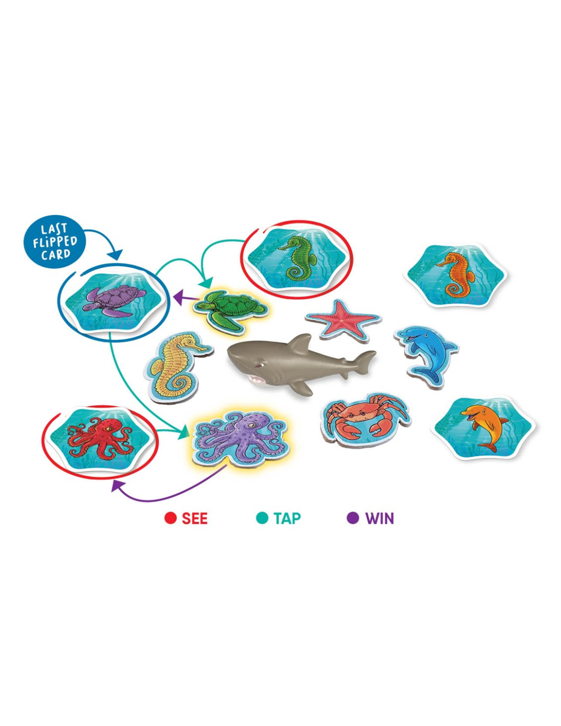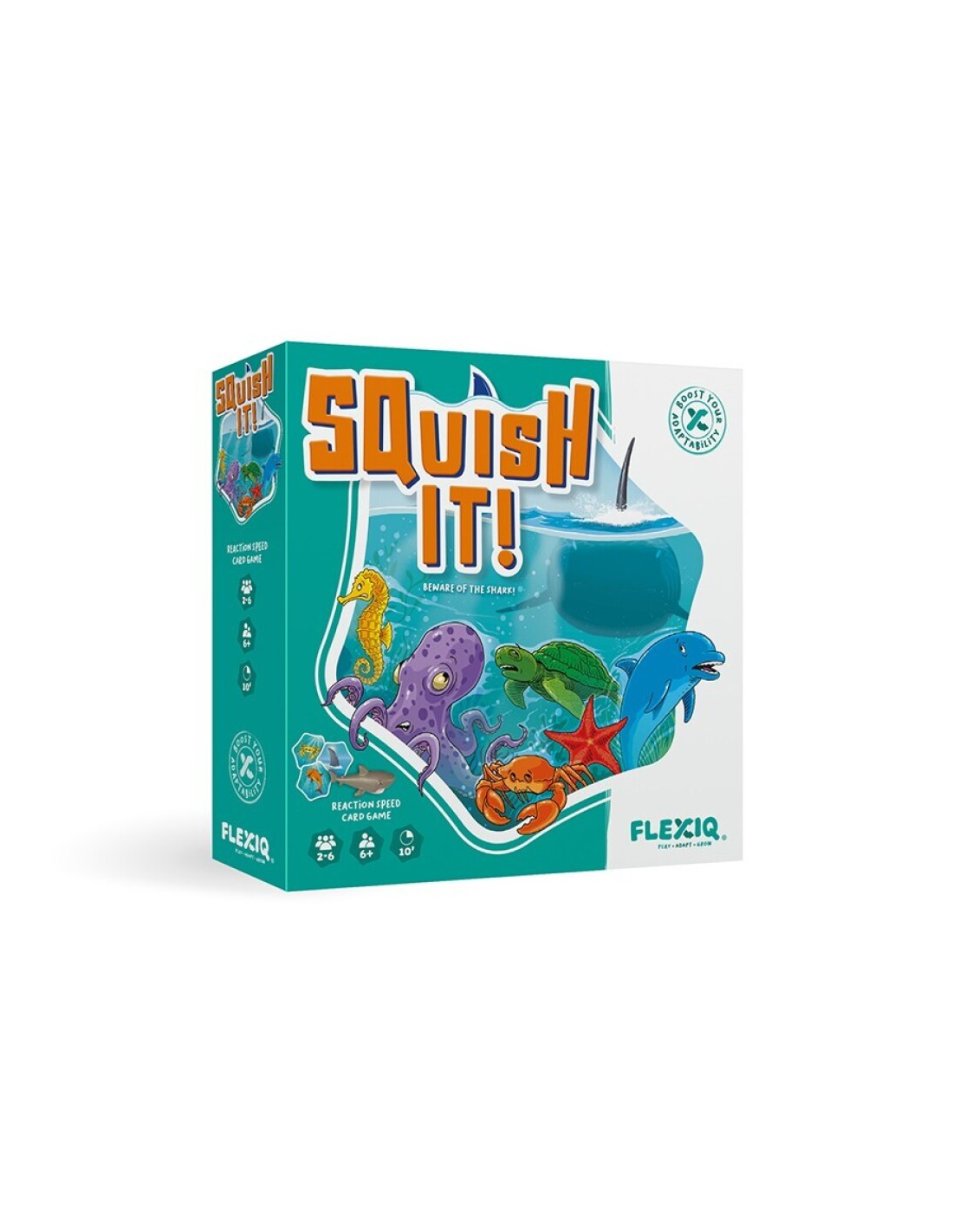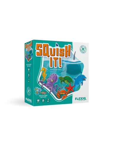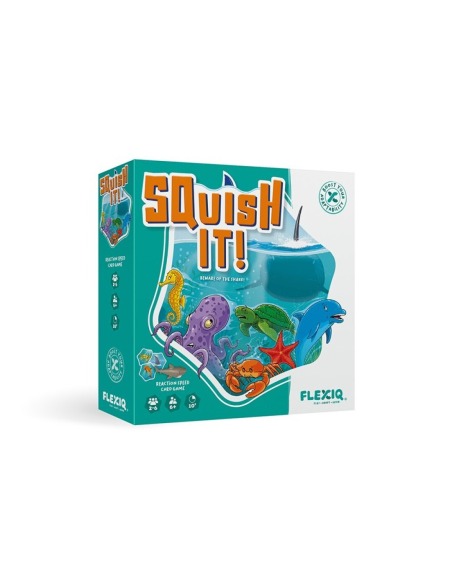 ¡Squish It! es un juego de cartas divertido, rápido y rompedor para toda la familia. Intenta encontrar una combinación válida entre 1 de los 6 animales marinos y su color correcto. Cuando lo consigas, sé el primero en tocar la ficha del animal correspondiente en el centro de la mesa y recoge cartas. Cada nueva carta cambia las posibles combinaciones. ¡A veces incluso se pueden conseguir dos combinaciones con solo voltear una carta! Y cuando aparezca una carta de tiburón, aplástalo rápidamente en el centro de la mesa para evitar perder cartas. Gana quien consiga más cartas