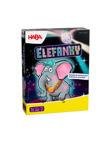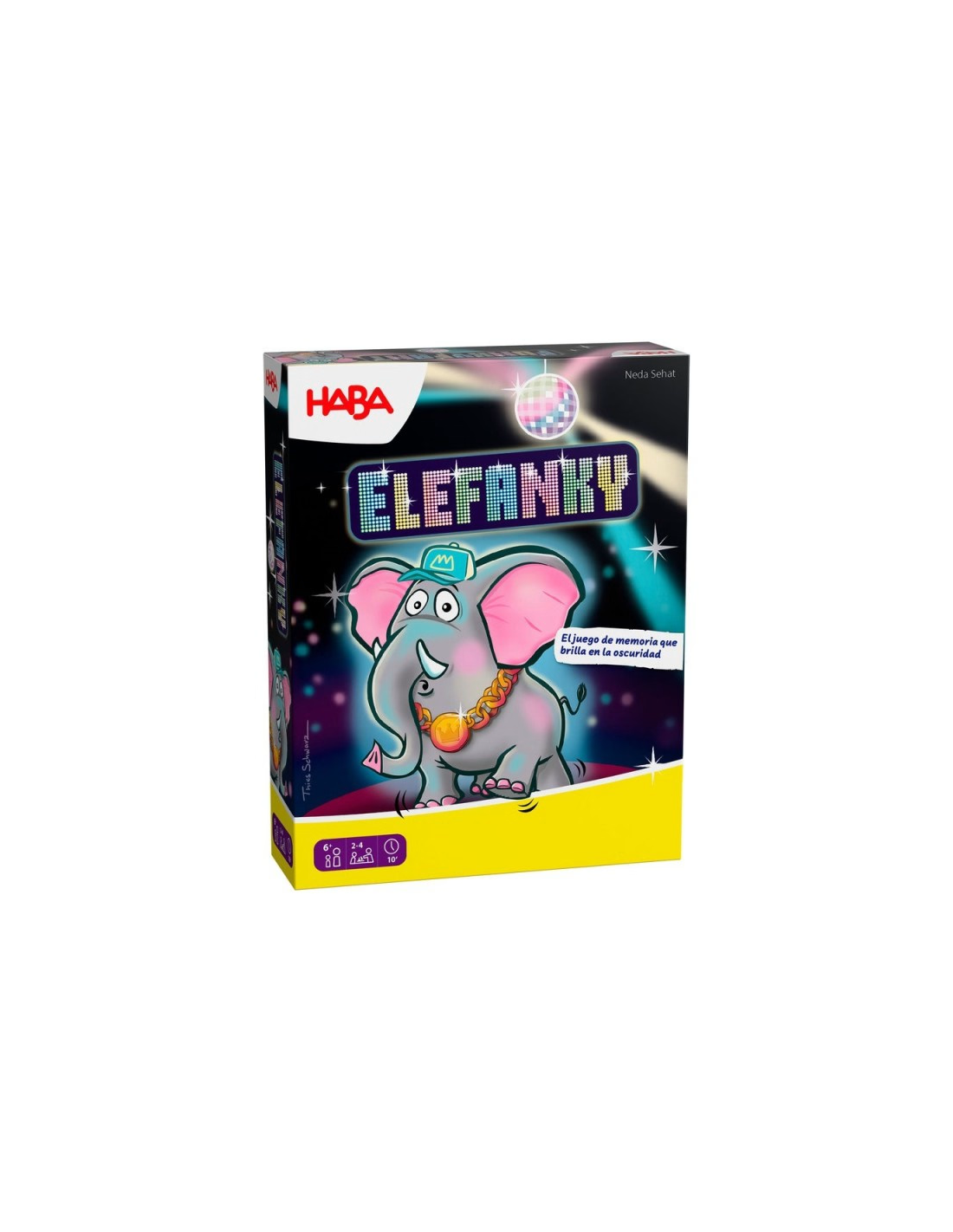 Elefanky es un juego de mesa para niños de Haba que se presenta como un juego sencillo, que brilla en la oscuridad, que permite a los jugadores jugar de inmediato.