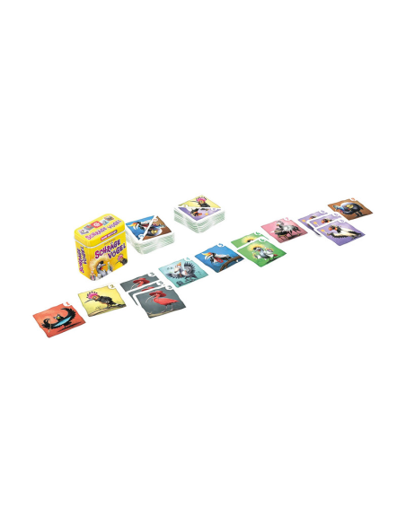 Pájaros locos, puntos locos! Juego de cartas en el que por turnos vamos iremos decidiendo qué cartas nos quedamos y cuales pasamos, con el objetivo de conseguir la mayor cantidad de puntos reuniendo tantos pájaros locos como sea posible. Pero la puntuación es tan loca como los propios pájaros: cada pájaro solo suma puntos si tienes una cantidad impar de cada tipo de pájaro frente a ti al final de la partida. Ten siempre en cuenta el riesgo: el anverso de cada carta muestra dos pájaros, pero ¡solo uno de los dos está en el reverso! De modo que con cada carta la probabilidad es 50:50: ¿es exactamente el pájaro que necesitas o estás cometiendo un gran error? ¿Dudas? Quizás prefieras darle la carta a otro jugador...