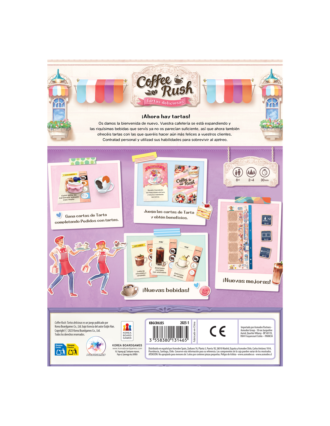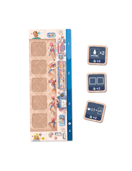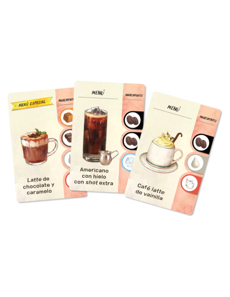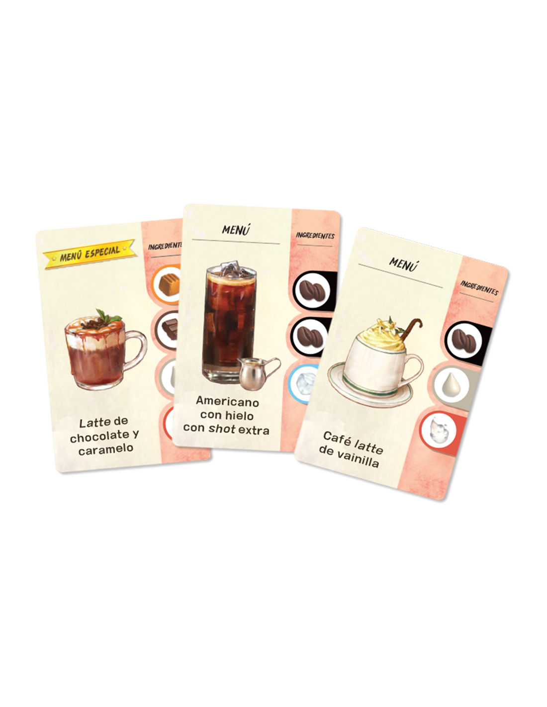 Tablero de Ingredientes x 1, tableros individuales x 4, fichas de Mejora x 16 (4 de cada color: rojo, azul, verde y amarillo), peones x 6 (2 rojos, 2 azules, 1 verde y 1 amarillo), reglamento x 1, bandejas para ingredientes x 2, cartas de Pedido x 80, tazas x 12, granos de café x 18, leche x 12, vapor x 12, hielo x 12. chocolate x 12, caramelo x 12, hojas de té x 12, agua x 12, fichas de Ingrediente x 102, fichas de Rapidez x 15, marcador de Jugador inicial x 1.