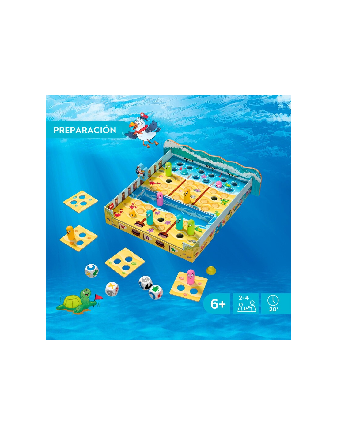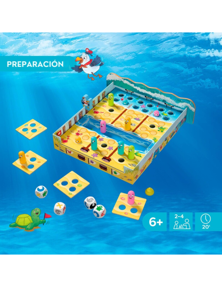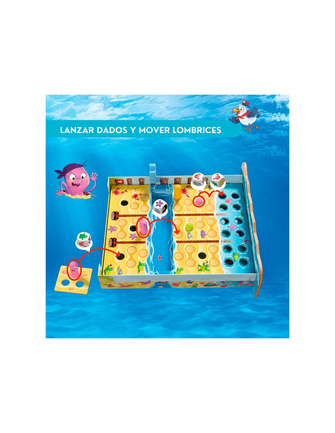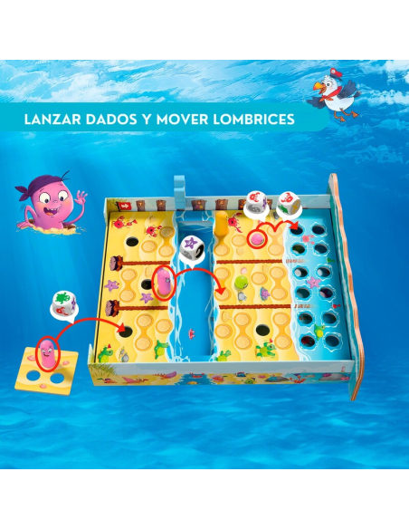 Hoy hay un gran bullicio en la playa, ya que comienza la Gran Carrera de lombrices de mar. Solo con suerte con los dados, los equipos de lombrices de mar irán a toda velocidad por la pista de carreras para llegar lo más rápido posible al arrecife. Pero, ¡atención! La ola puede arrastrarlas si no se esconden a tiempo en los agujeros de la arena. Ganará la carrera quien haga llegar a la meta en primer lugar a sus lombrices de mar con una buena táctica y un poco de suerte con los dados.