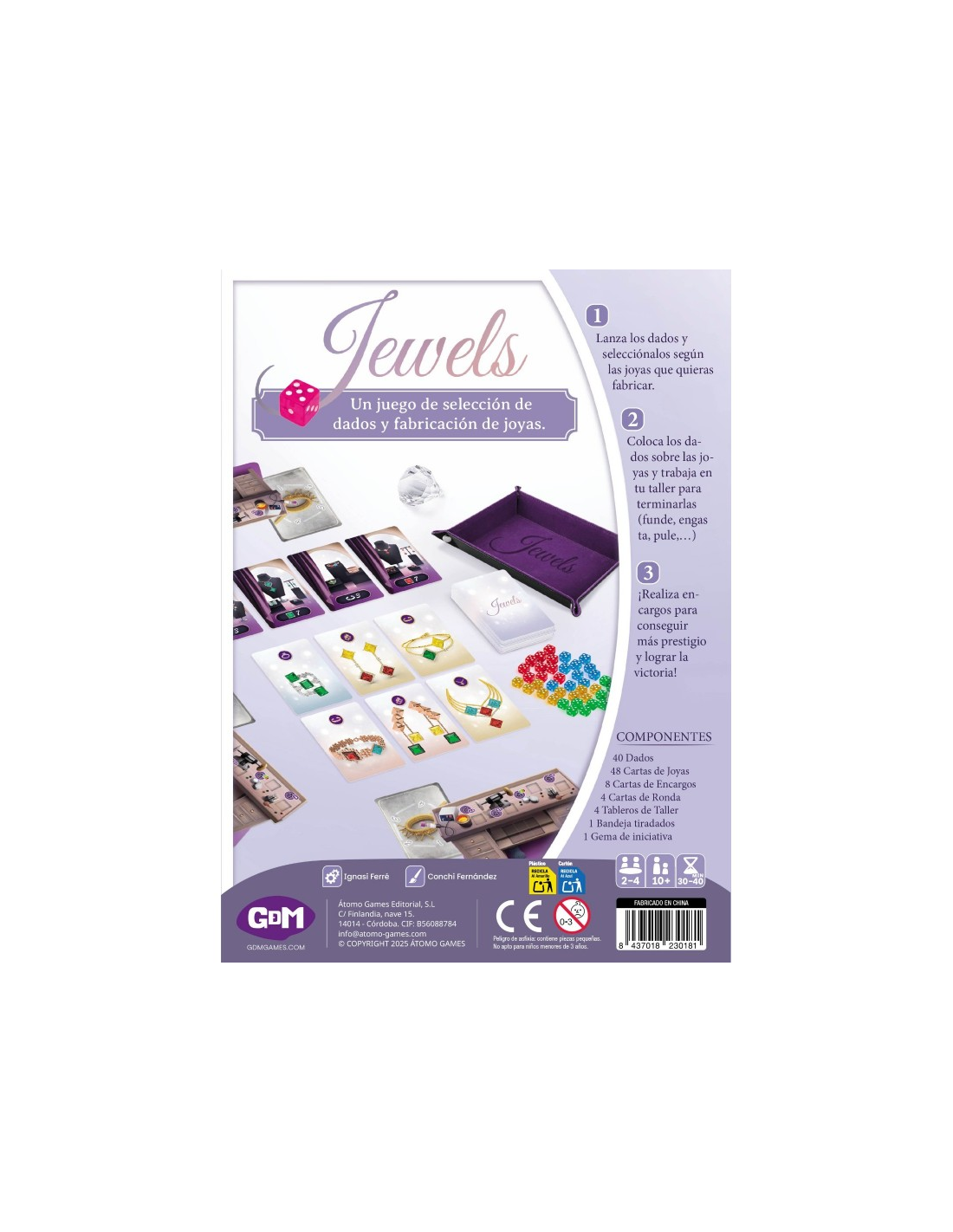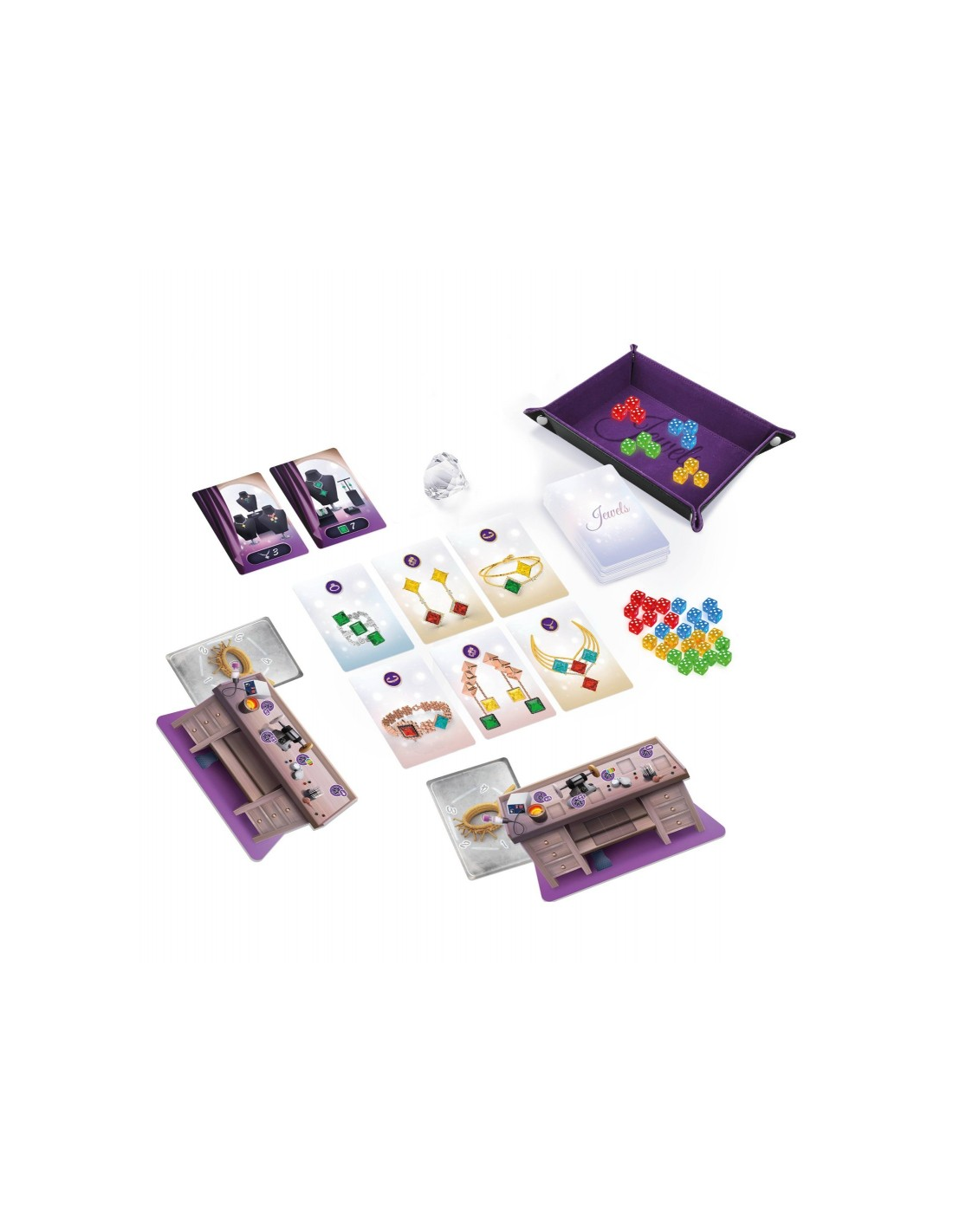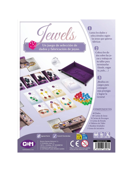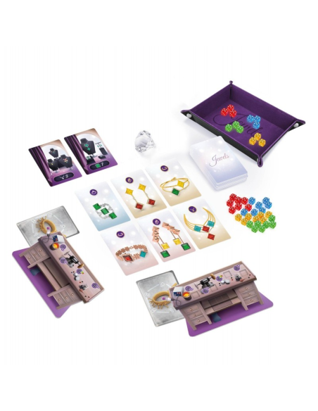 Jewels es un juego de estrategia de 2 a 4 jugadores y a partir de 10 años, en el que te conviertes en un auténtico joyero: seleccionas gemas con dados, los transformas en colgantes, anillos, pendientes o pulseras mediante cartas de diseño, y las engastás con habilidad para maximizar tu puntuación.