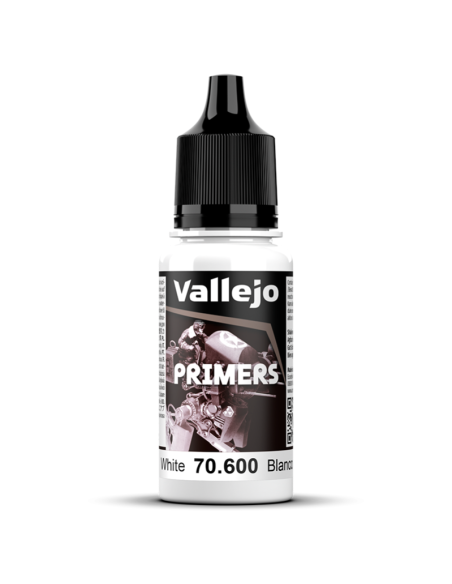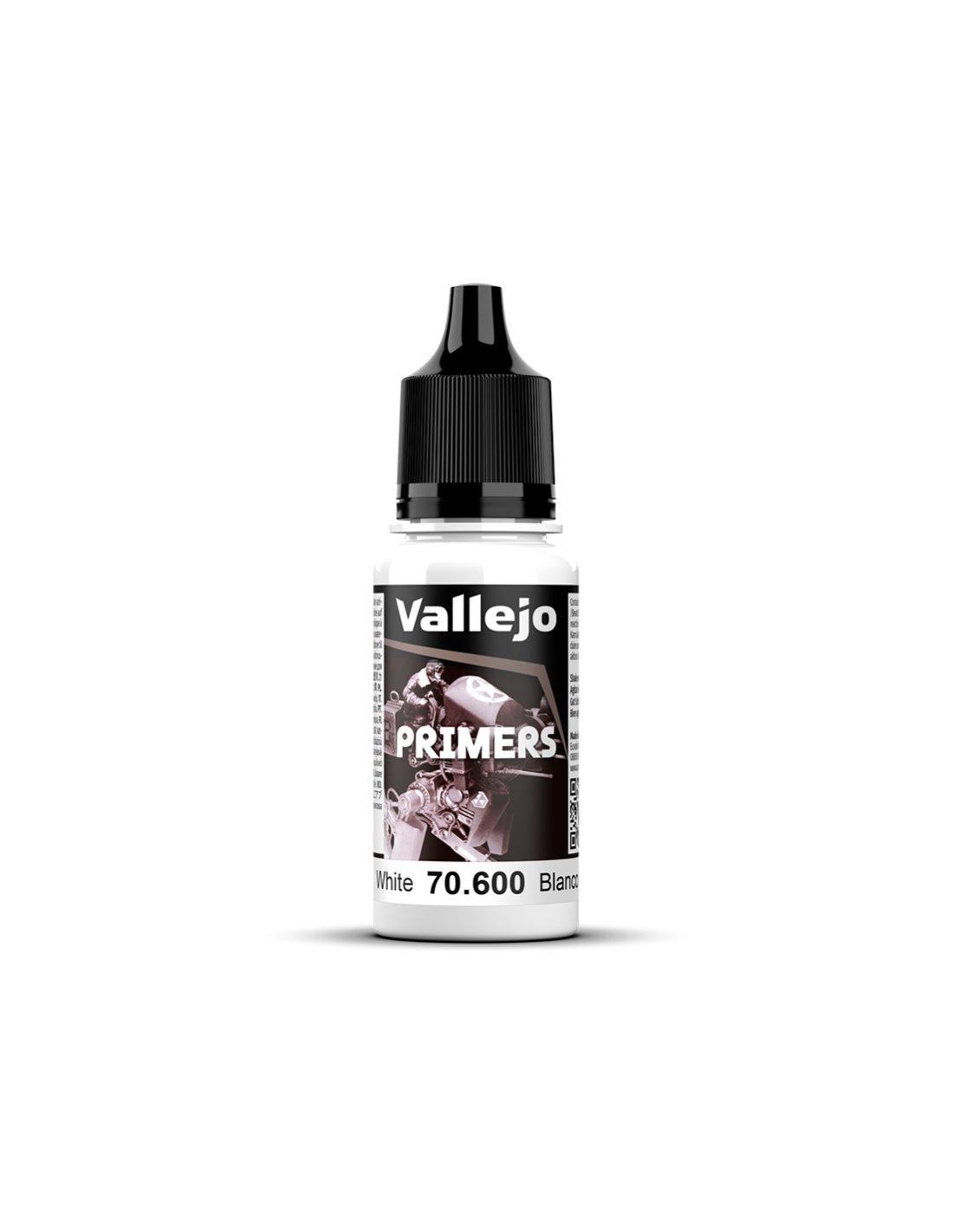 Primer Color Blanco. Envase de 18 ml. Se distribuye en cajas de 6 envases. Imprimación de gran resistencia y dureza, formulada con resina acrílica de base agua, de secado mate especialmente formuladas para aerografía. Vallejo Surface Primer no oculta los detalles de la maqueta y se puede aplicar sobre diversas superficies como resina, pvc, latón, metal blanco o madera.