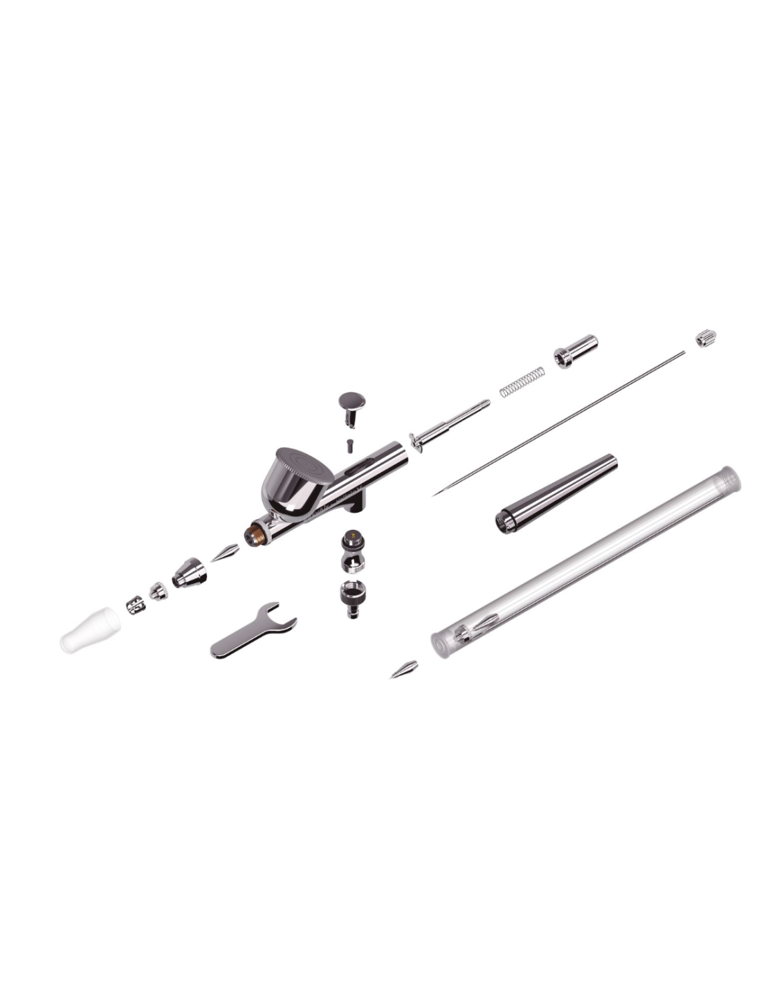 y ergonómico, incluye una función de doble acción independiente por sistema de gravedad con un uso muy intuitivo. De boquilla flotante, con un fácil proceso desmontaje y limpieza. Incluye un conjunto de aguja/boquilla de 0,3, una copa de 9 ml. y casquillo