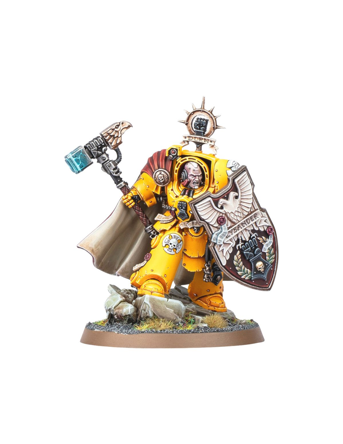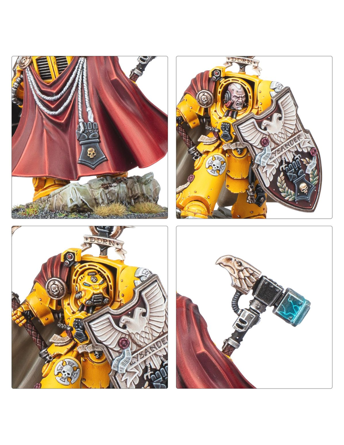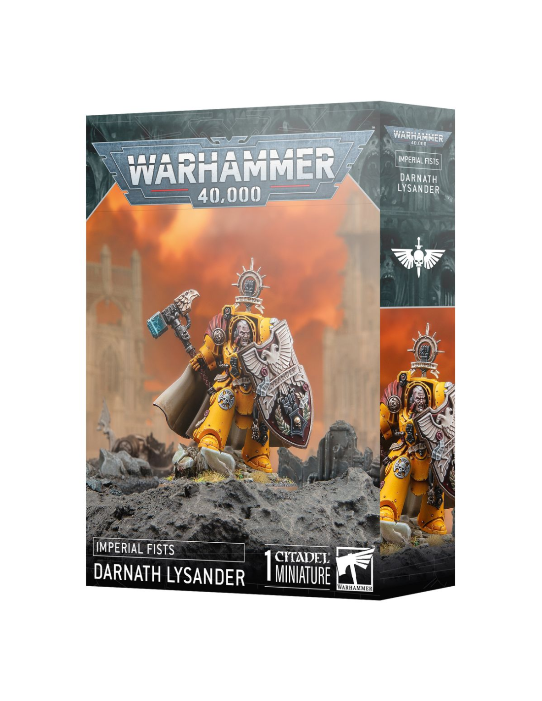 Darnath Lysander atraviesa a sus enemigos como un buque de guerra surcando mares tempestuosos. Sostiene en alto su escudo de tormenta, Muralla, mientras golpea con el Puño de Dorn, y cada impacto de su martillo convierte a sus enemigos en una pasta viscosa, haciendo saltar por los aires filas enteras de guerreros. Y todo con una mirada impasible y una determinación inquebrantable.