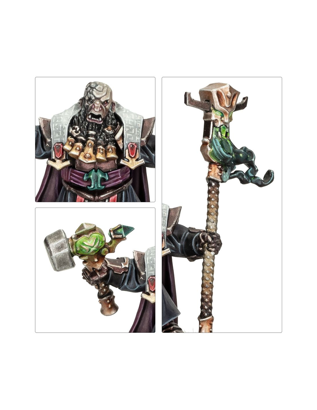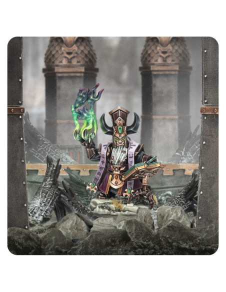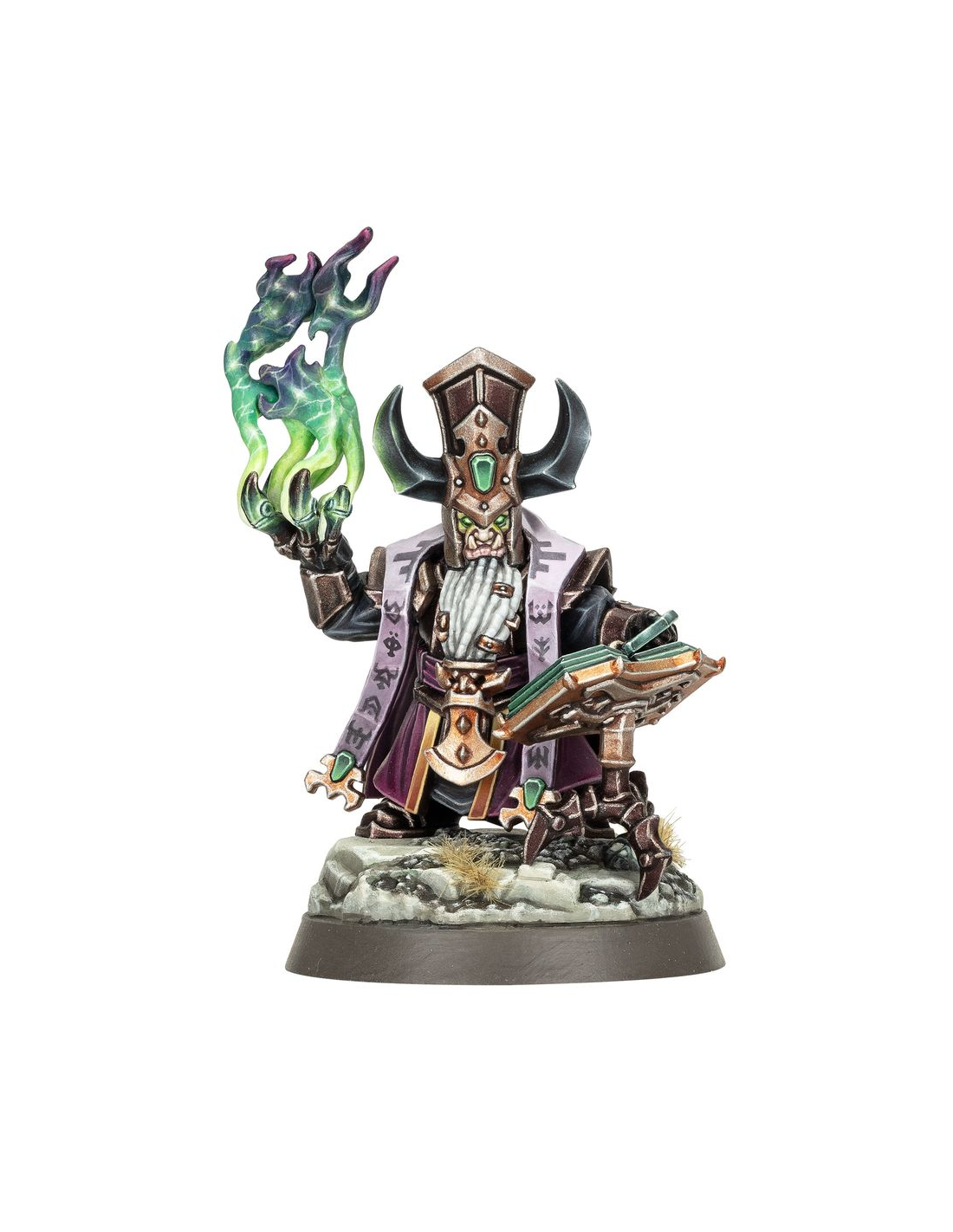 Con este kit multicomponente de plástico puedes montar un Herrero Daemónico, un infernal hechicero para tus ejércitos de Herreros Infernales de Hashut de Warhammer Age of Sigmar. Esta miniatura es una visión imponente, cargada de riqueza y poder. Sujetando en alto un Espolón de hierroscuro, está preparado para arrojar ráfagas de energía destructora contra sus enemigos. Su retorcido conocimiento es también capaz de avivar las fraguas daemónicas de las máquinas de guerra hashutitas.