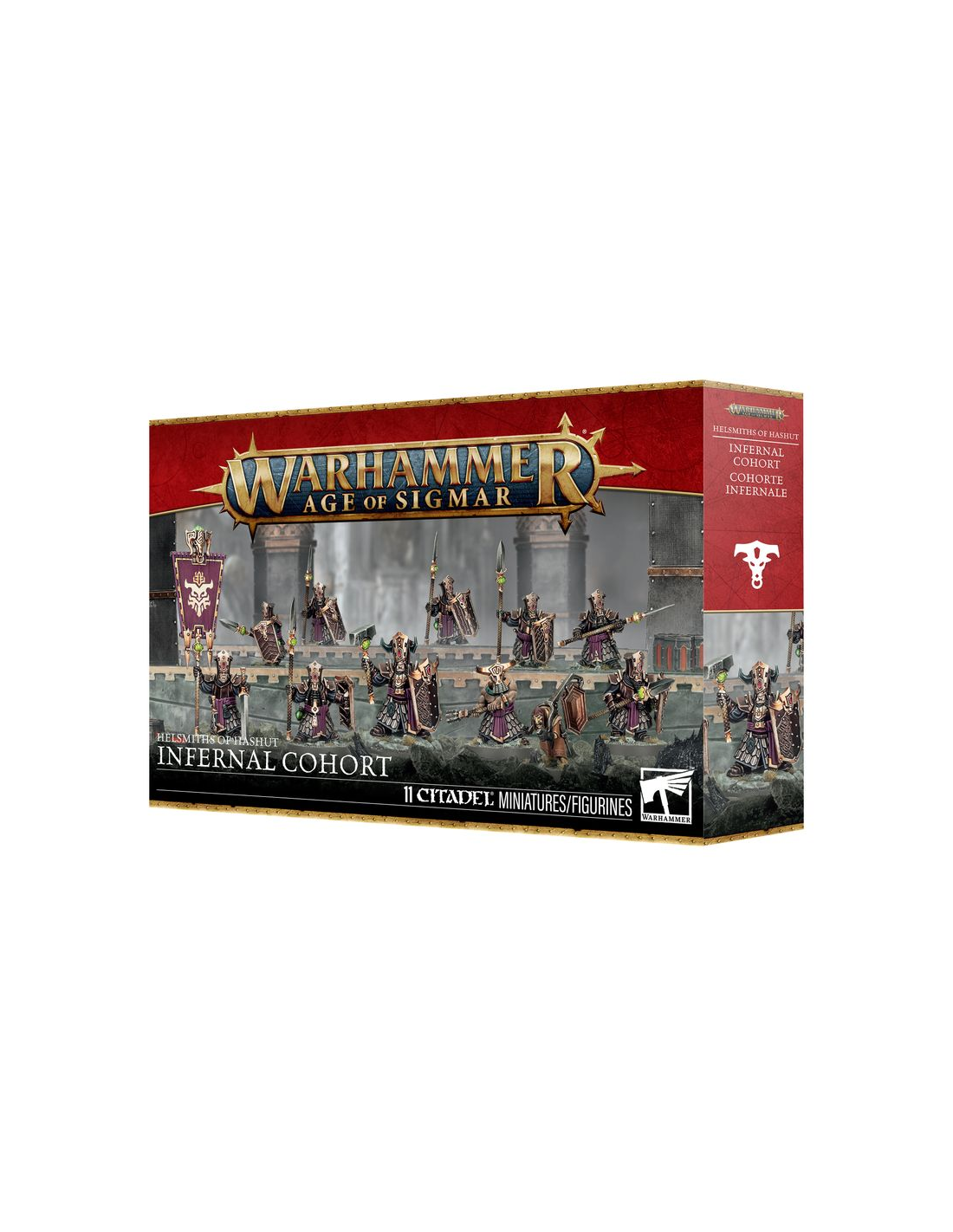 Con este kit multicomponente de plástico puedes montar diez guerreros de Cohorte Infernal y su Hobgrot con gong, infantería fuerte y duradera para tus ejércitos de Herreros Infernales de Hashut de Warhammer Age of Sigmar. Pueden estar armados con temibles filos de Hashut para despedazar al enemigo, o con las más defensivas lanzas de Hashut. Son tropas resistentes ideales para mantener objetivos o atravesar el fuego enemigo.