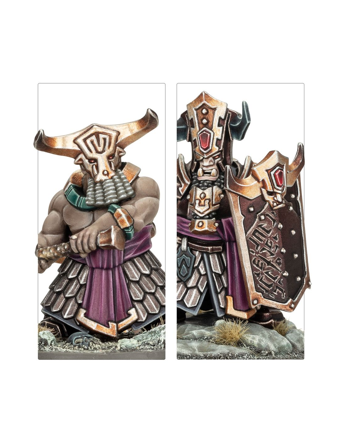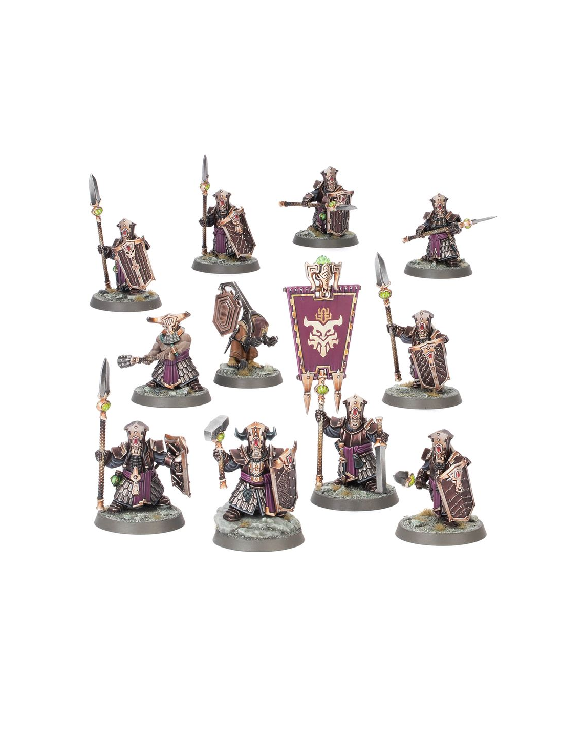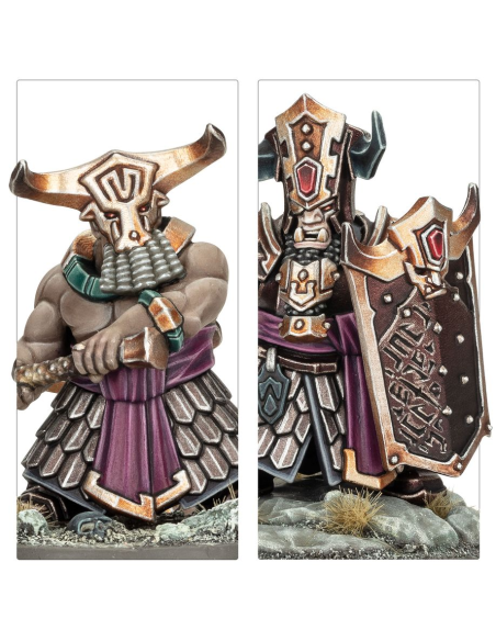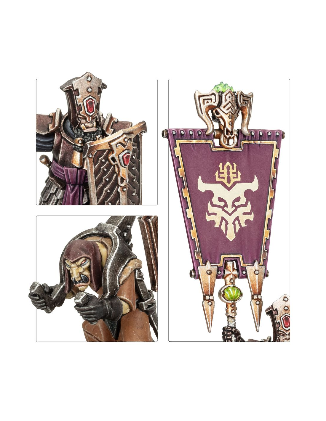 El kit también incluye piezas para montar un campeón opcional con una selección de dos cabezas y armado con un hacha de dos manos o con martillo y escudo. El portaestandarte opcional puede elegir entre tres cabezas y tres sombreretes para el estandarte. El músico opcional va acompañado de un Hobgrot que puede elegir entre dos cabezas. Los escudos y brazos izquierdos son intercambiables entre todas las miniaturas, haciendo que personalizar a tus disciplinados y despiadados guerreros sea de lo más sencillo.