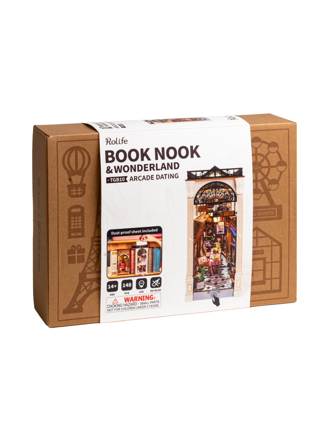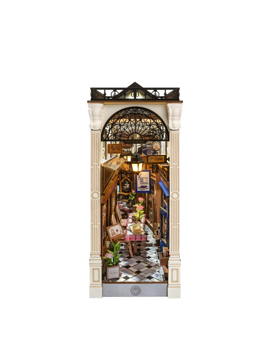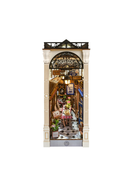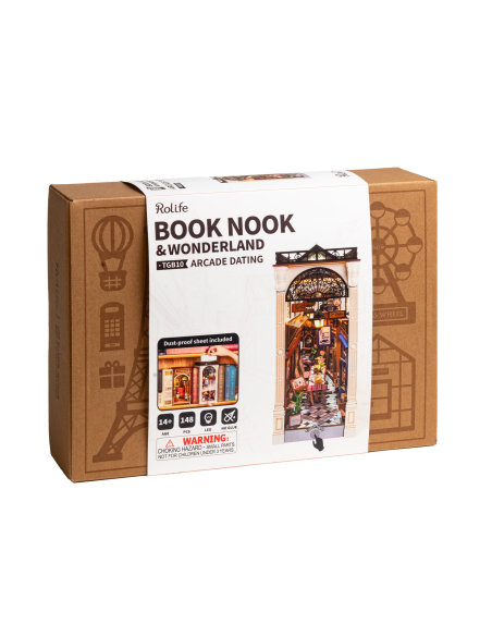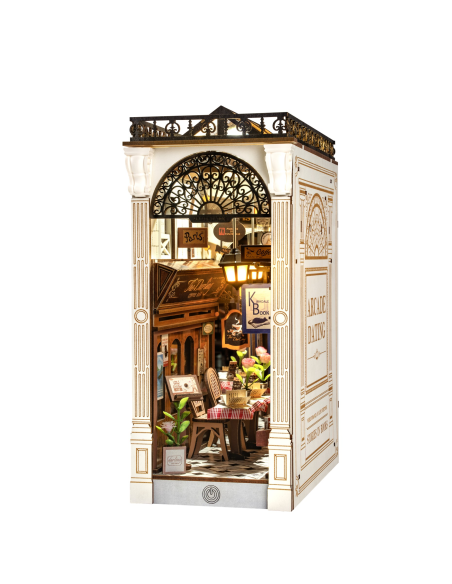 Transforma tu estantería en un rincón romántico con **Arcade Dating de Rolife**, un encantador **book nook** inspirado en las calles europeas más pintorescas. Este kit en miniatura recrea una acogedora escena con una cafetería rústica, una librería con detalles vintage y un balcón que evoca historias de amor atemporales. La cálida iluminación LED resalta cada elemento, creando un ambiente íntimo y evocador.