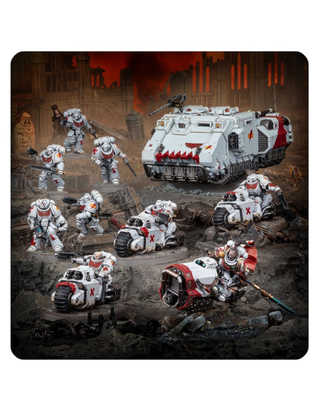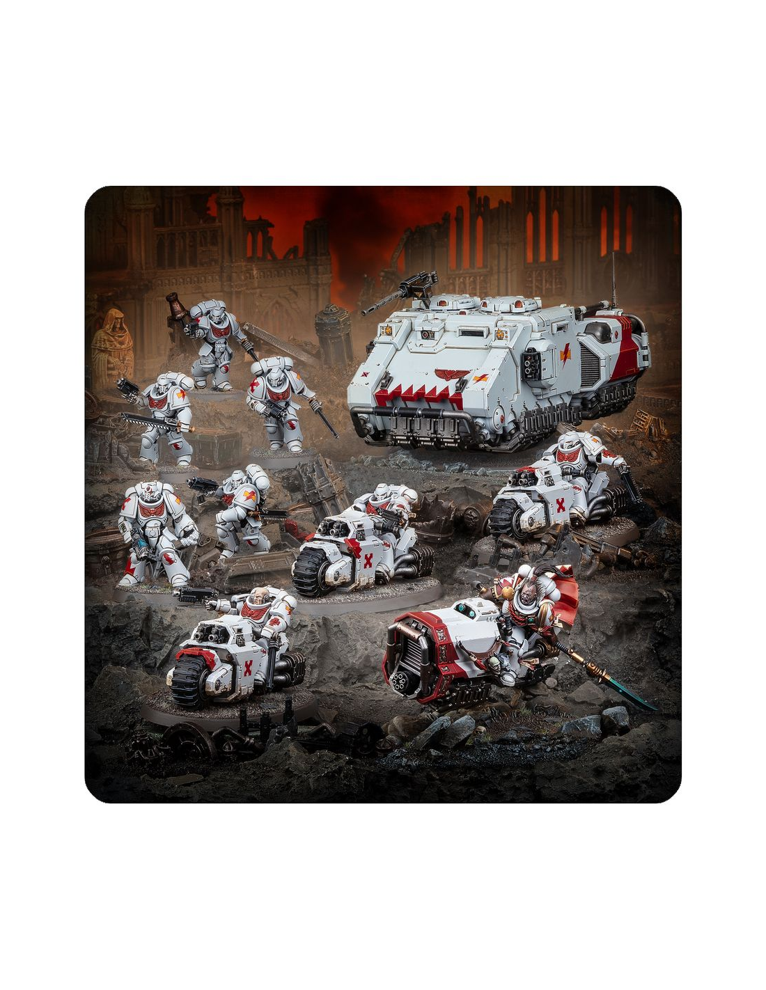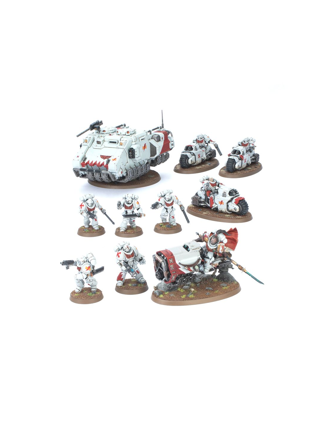 Si quieres llevar la lucha al enemigo lo antes posible, esta caja es la forma perfecta de empezar o ampliar una colección de Cicatrices Blancas de forma más económica que comprando los kits por separado. Liderados por Suboden Khan montado en Trueno, su moto gravitatoria, y un trío de motoristas Batidores, son una amenaza inmediata para cualquier enemigo lento o desprevenido. Los Intercesor de Asalto y su transporte Impulsor están preparados para acabar con lo que sobreviva al asalto inicial y tomar objetivos clave mientras el enemigo sigue aturdido. Estas diez miniaturas de plástico conforman una fuerza completa de Cicatrices Blancas para usar en disputadas partidas tácticas del formato Patrulla de Warhammer 40,000. Puedes descargar gratis las reglas para esta Patrulla del sitio web de Warhammer Community.