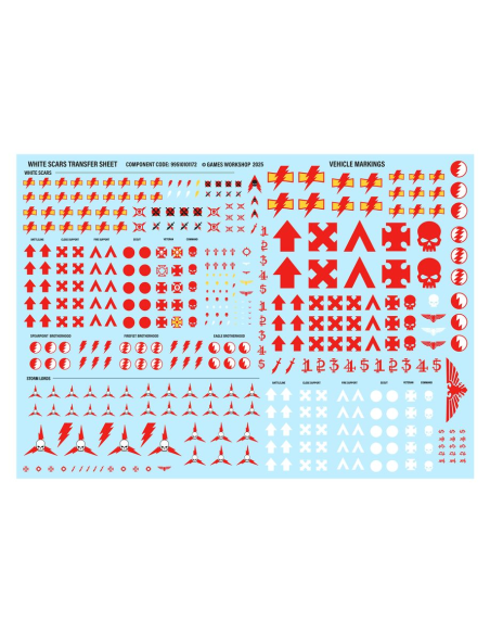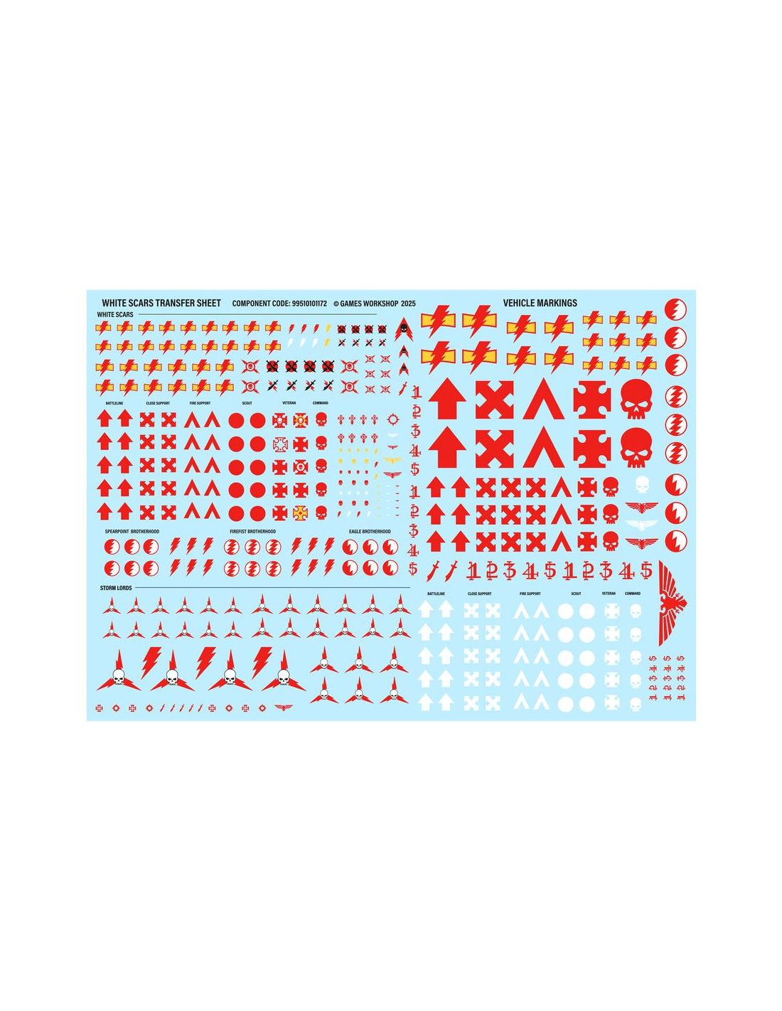 El kit viene con una nueva hoja de calcomanías para Cicatrices Blancas con 407 calcomanías al agua de gran calidad, con iconos del Capítulo, iconos de roles en batalla y números. También hay iconografía de las compañías de la Hermandad Punta de lanza, la Hermandad Puño de fuego y la Hermandad del Águila, así como del Capítulo sucesor de los Señores de las Tormentas.