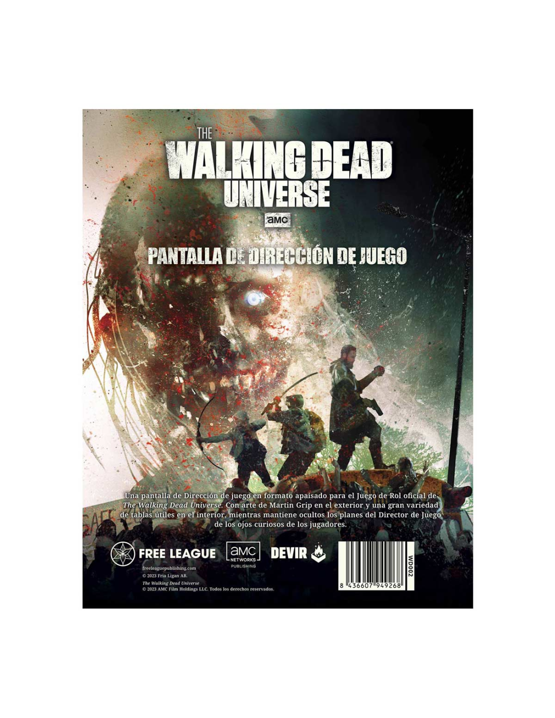 Una pantalla de Dirección de juego en formato apaisado para el Juego de Rol oficial de The Walking Dead Universe. Con arte de Martin Grip en el exterior y una gran variedad de tablas útiles en el interior, mientras mantiene ocultos los planes del Director de Juego de los ojos curiosos de los jugadores.