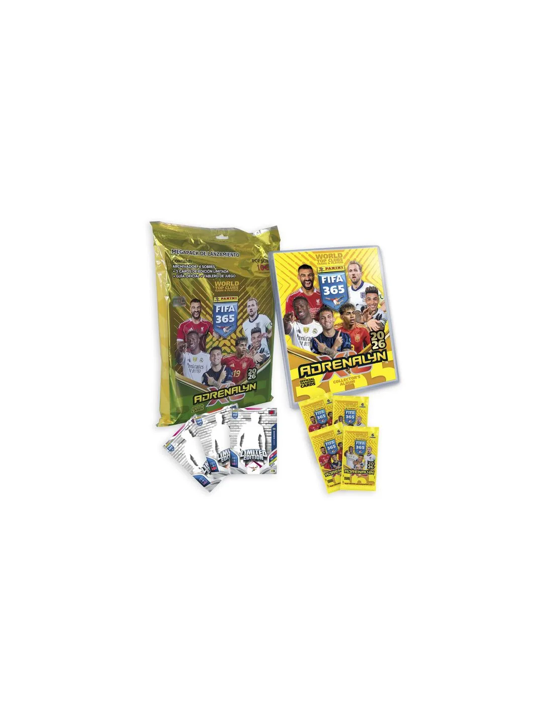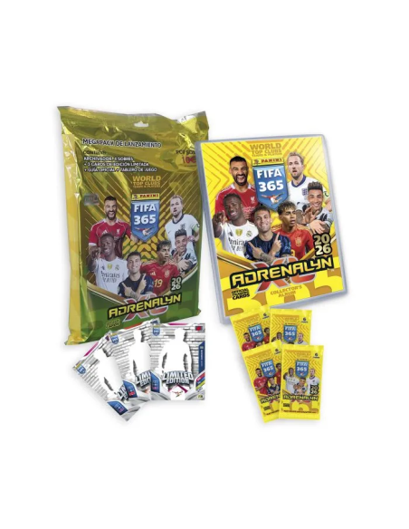 El Starter Pack sobres de la magnífica colección de Trading Cards PANINI FIFA 365 ADRENALYN XL 2026 contiene todo este espectacular material: