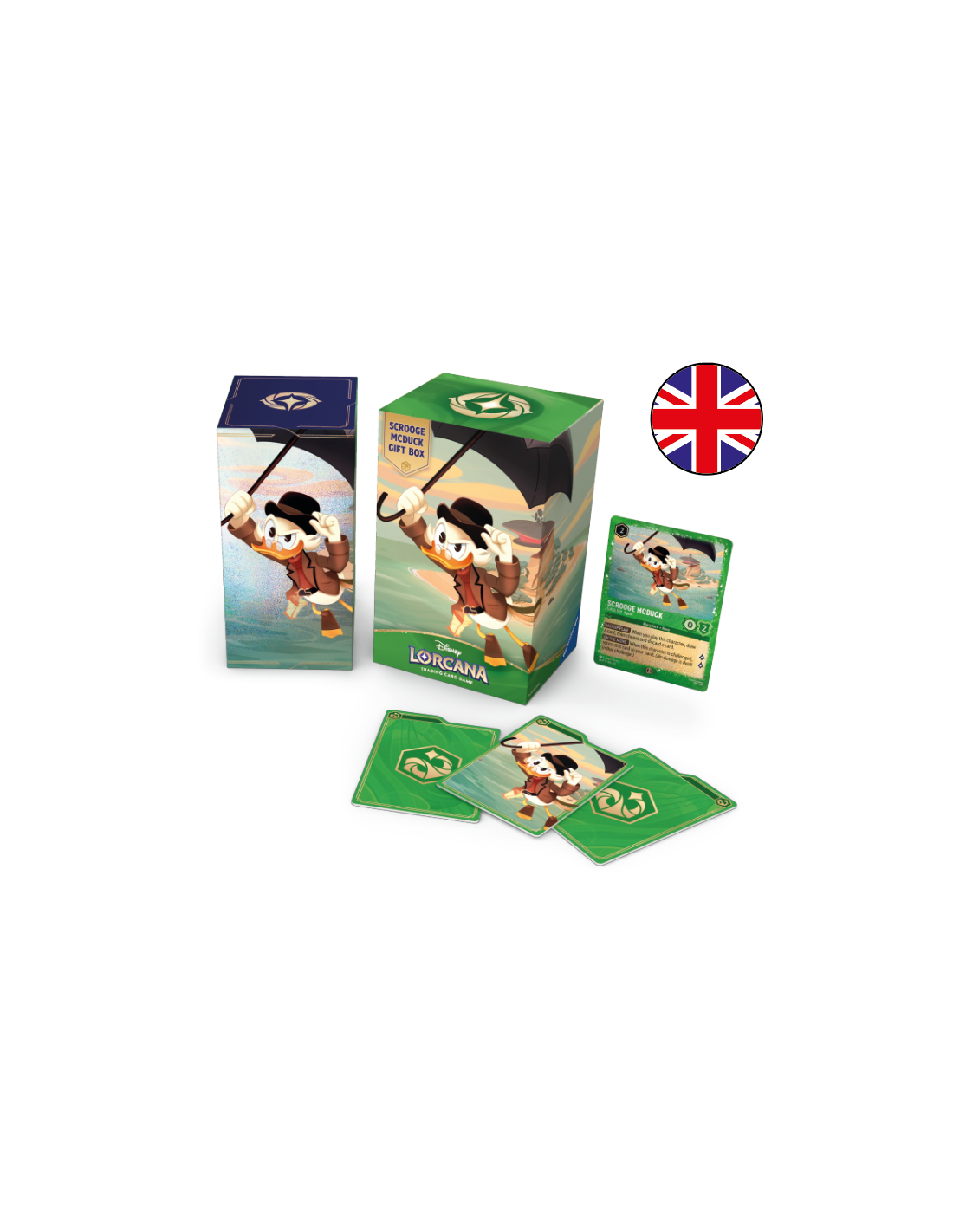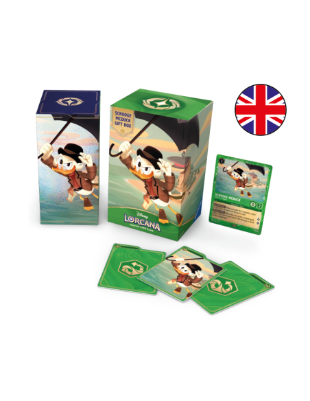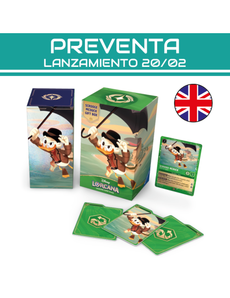 Caja de regalo Disney Lorcana TCG con temática de Scrooge McDuck. Incluye: 1 carta foil promocional Scrooge McDuck - S.H.U.S.H. Agent, 5 sobres de refuerzo (12 cartas c/u), 1 caja de almacenamiento (capacidad 252 cartas enfundadas) y 3 divisores troquelados. Ideal para coleccionistas y como producto destacado en tienda. Distribución para venta al por mayor.
