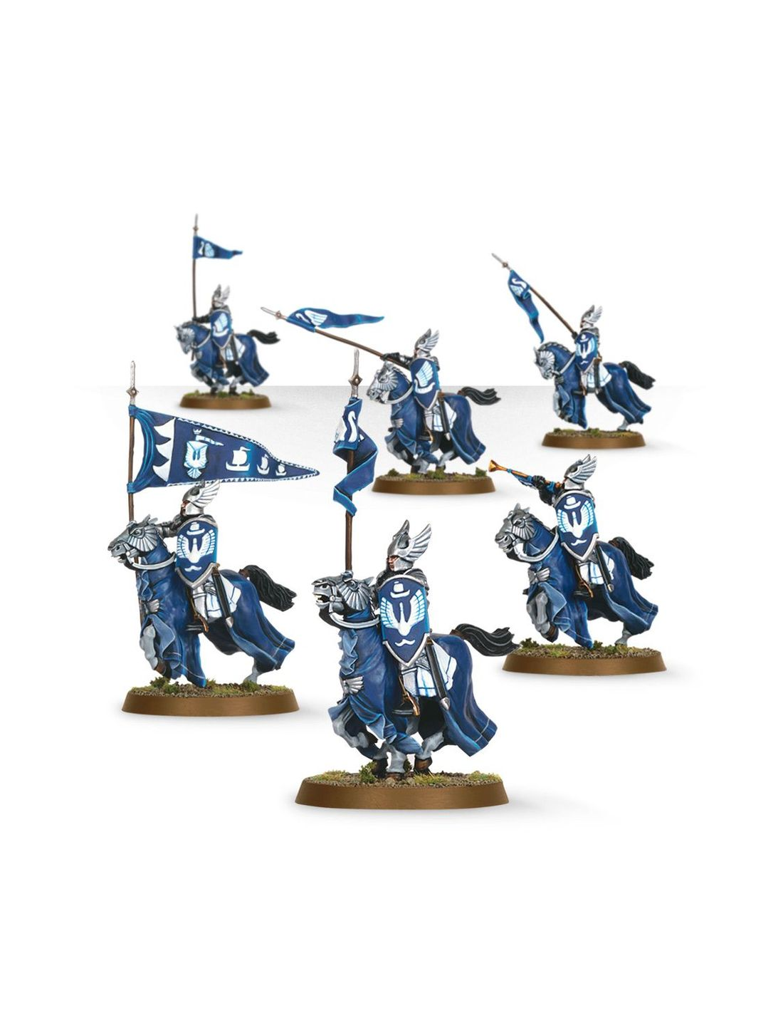 Esta caja contiene seis Caballeros de Dol Amroth de plástico. Esta caja de 39 piezas contiene: cinco diseños de cabeza diferentes, cinco variaciones de armas con lanza, tres diseños de escudo, tres variaciones de caballo, un estandarte con detalles esculpidos y un brazo con trompeta. Las miniaturas se suministran con peanas redondas de 40mm.